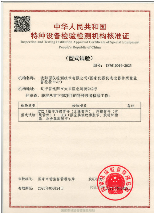 經(jīng)國家市場監(jiān)督管理總局審查,獲準(zhǔn)從事DYX(限非焊接管件(無縫管件)、焊接管件(有縫管件))、DBX(限金屬波紋膨脹節(jié)、旋轉(zhuǎn)補(bǔ)償器、非金屬膨脹節(jié))特種設(shè)備型式試驗(yàn)檢驗(yàn)工作。